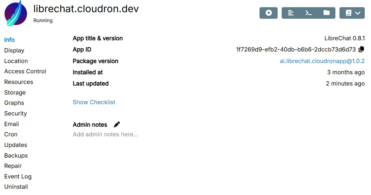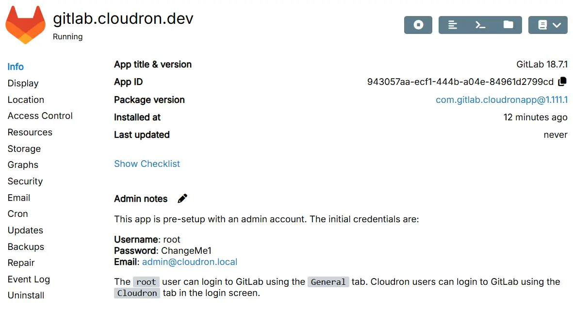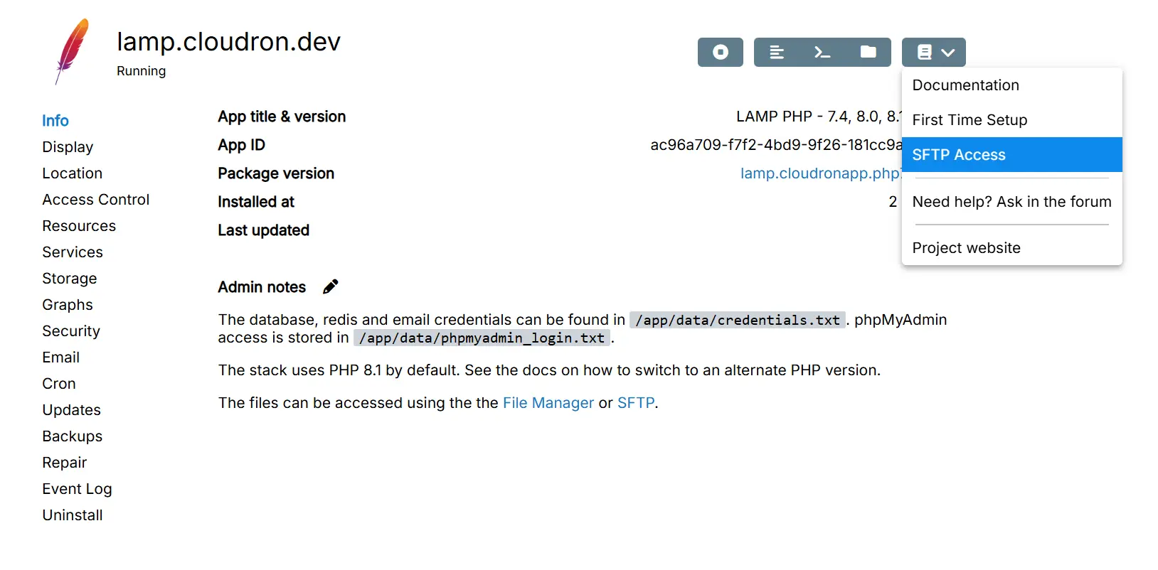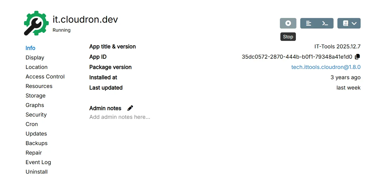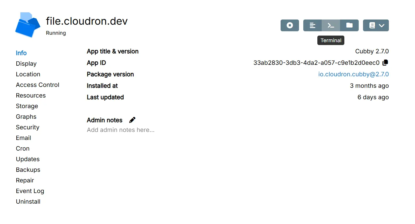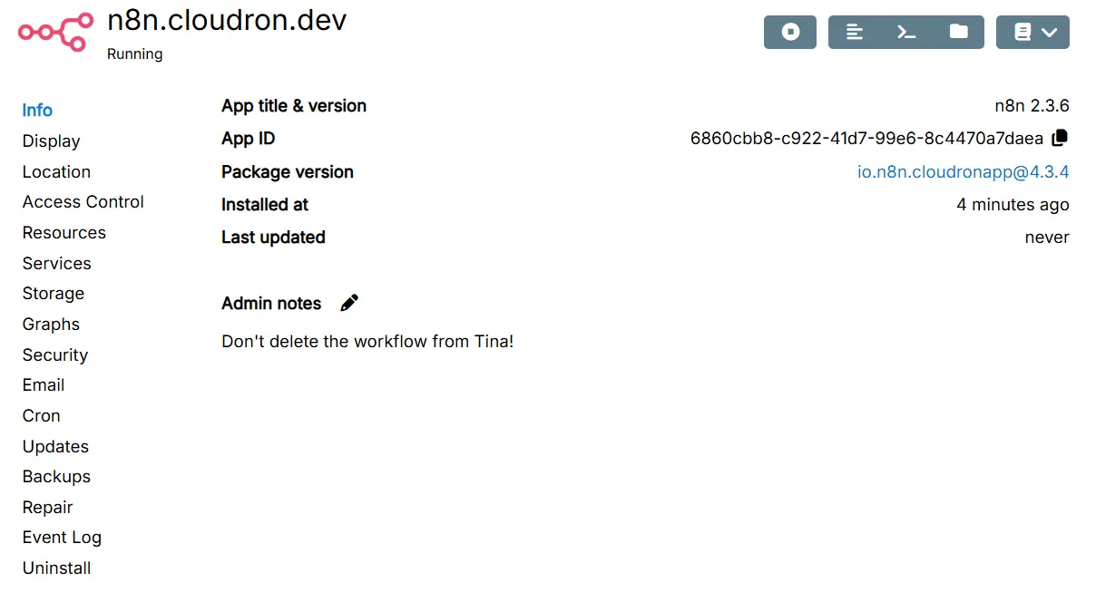 App Title and Version- This is the app's title and the upstream app versionApp ID- Unique ID of the app instancePackage Version- Version of the Cloudron package. This is distinct from the (upstream) App VersionInstalled At- When the app was installedLast Updated- When the app was last updated