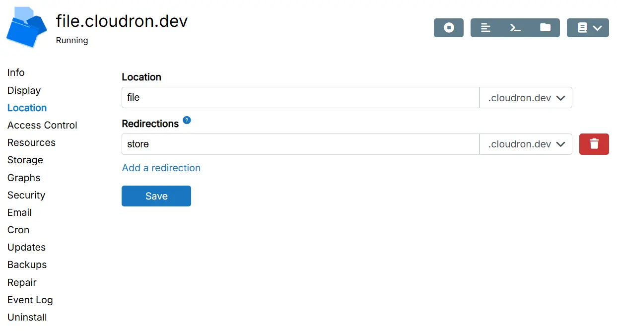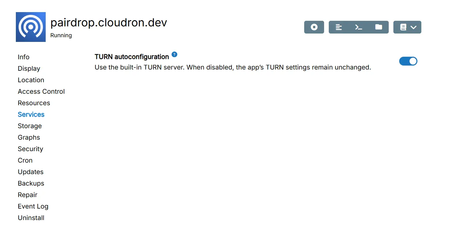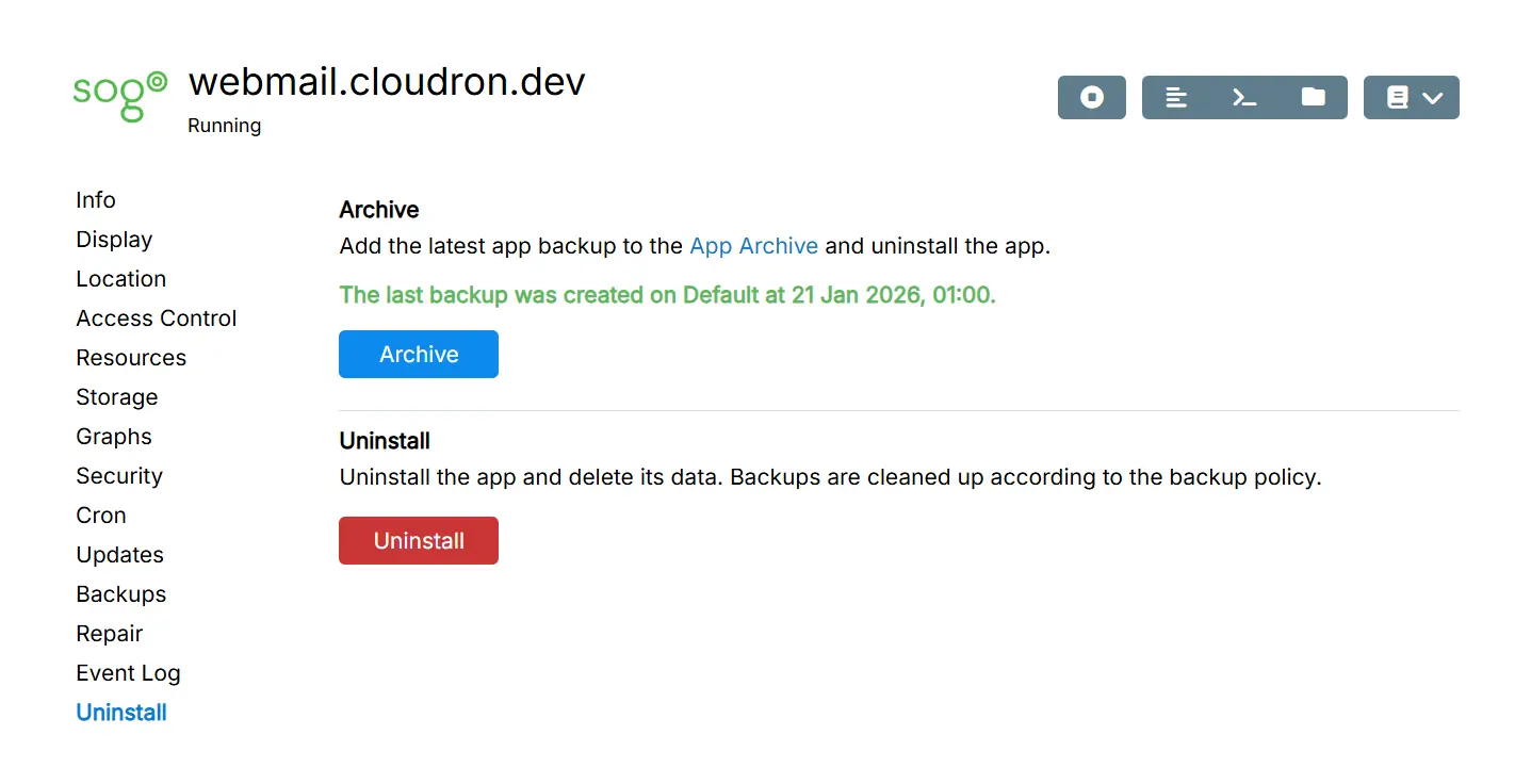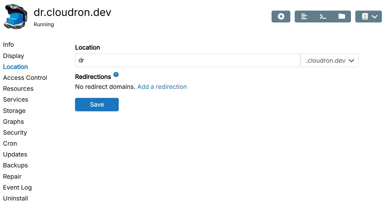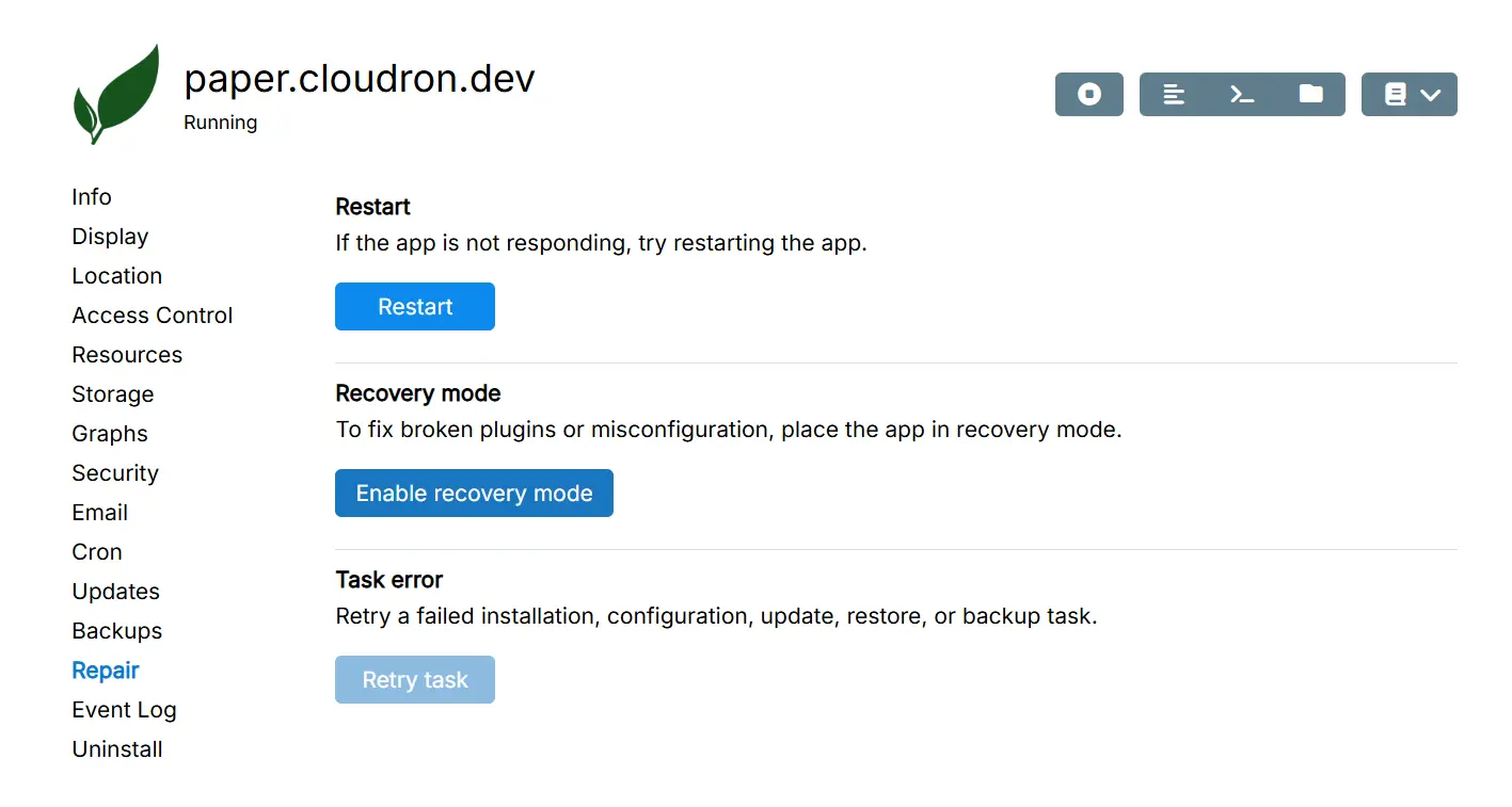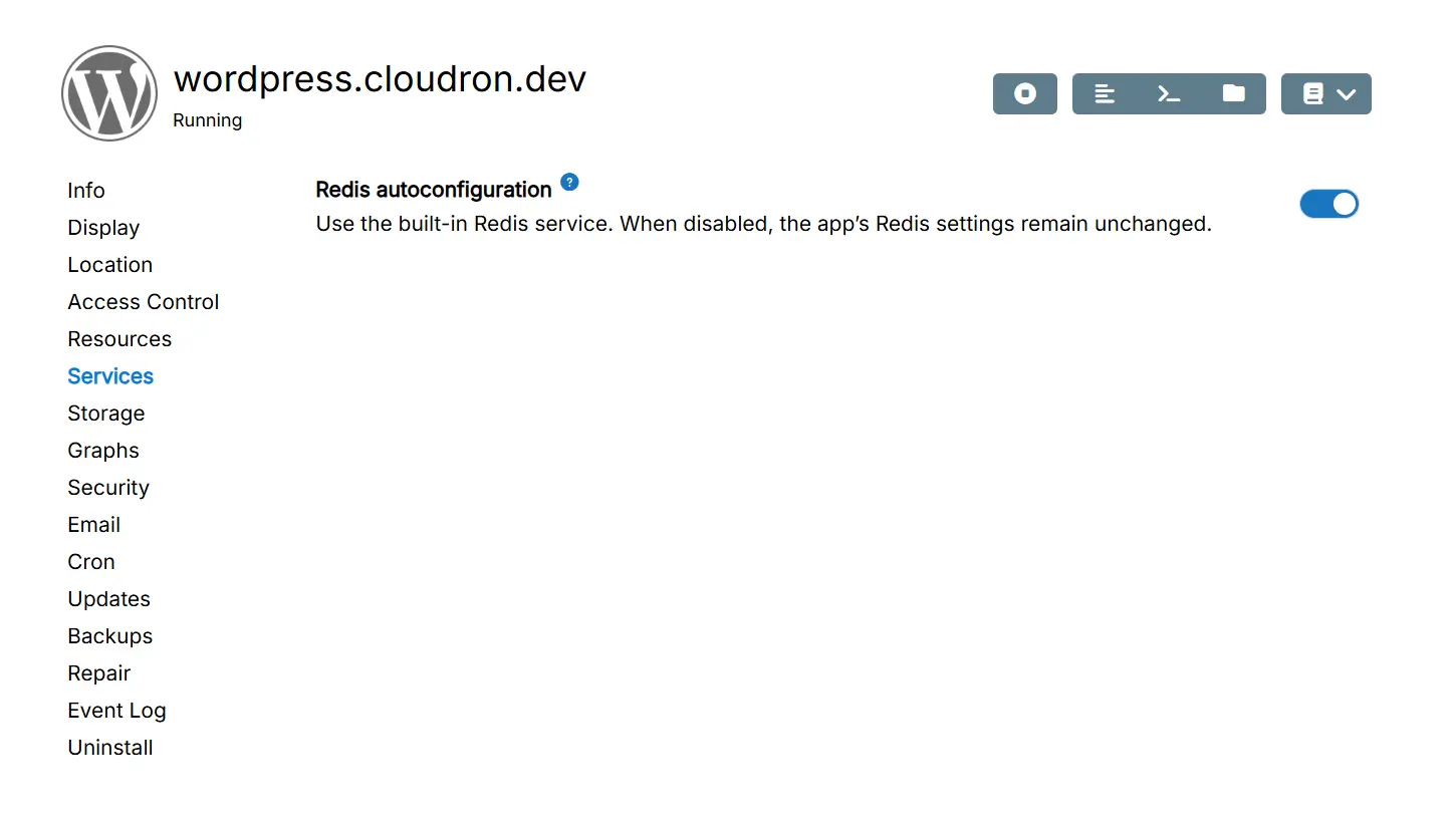 App Title and Version- This is the app's title and the upstream app versionApp ID- Unique ID of the app instancePackage Version- Version of the Cloudron package. This is distinct from the (upstream) App VersionInstalled At- When the app was installedLast Updated- When the app was last updated