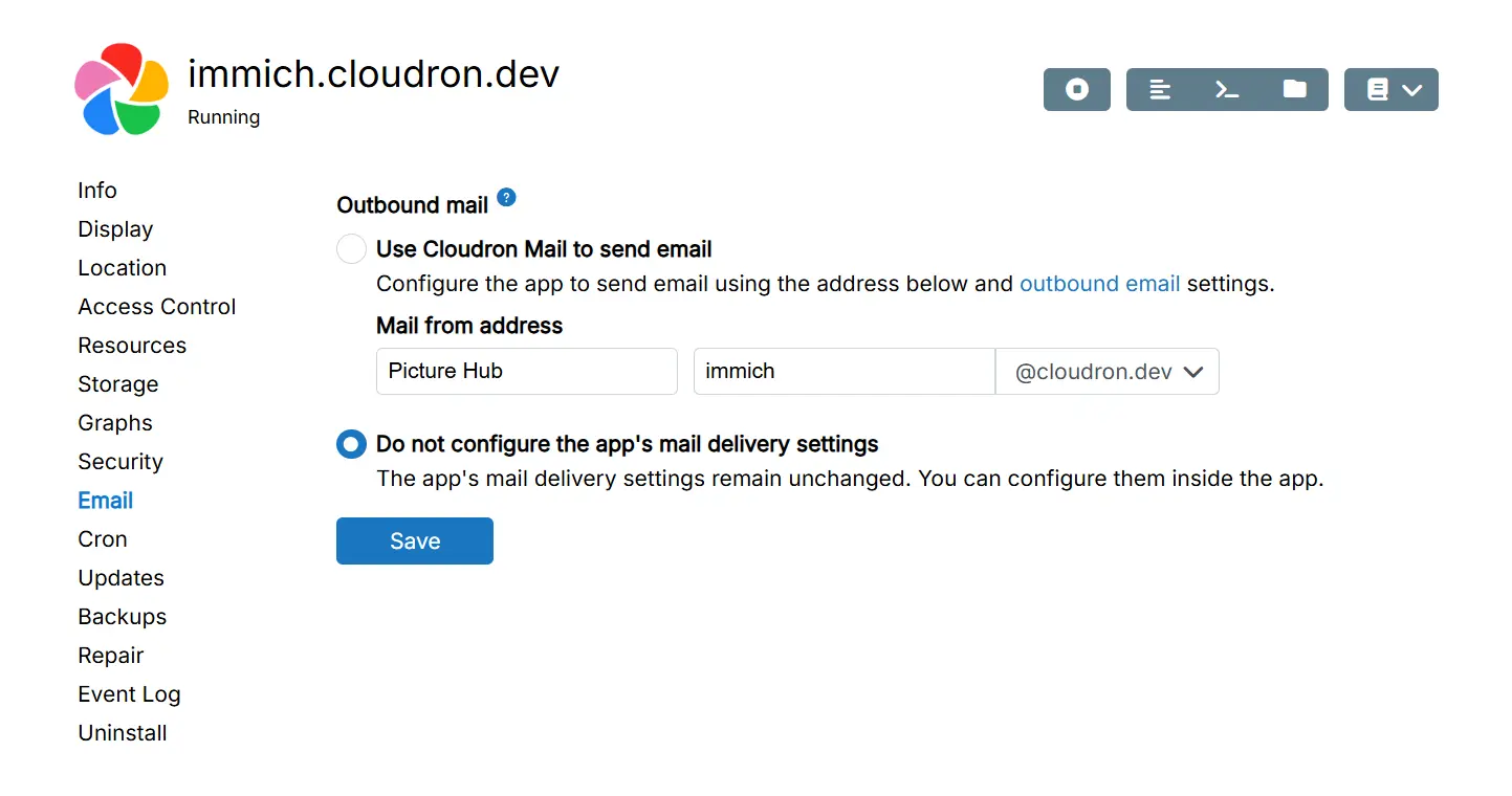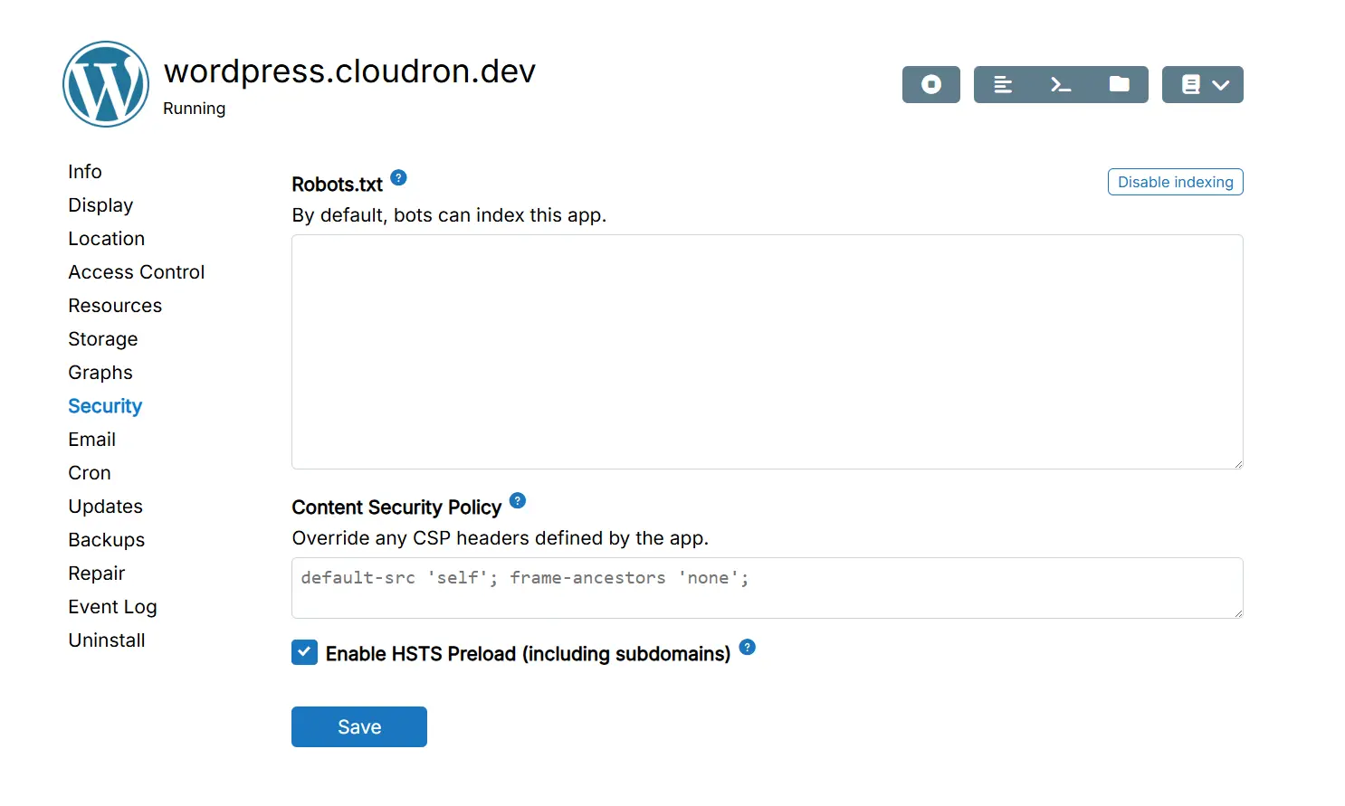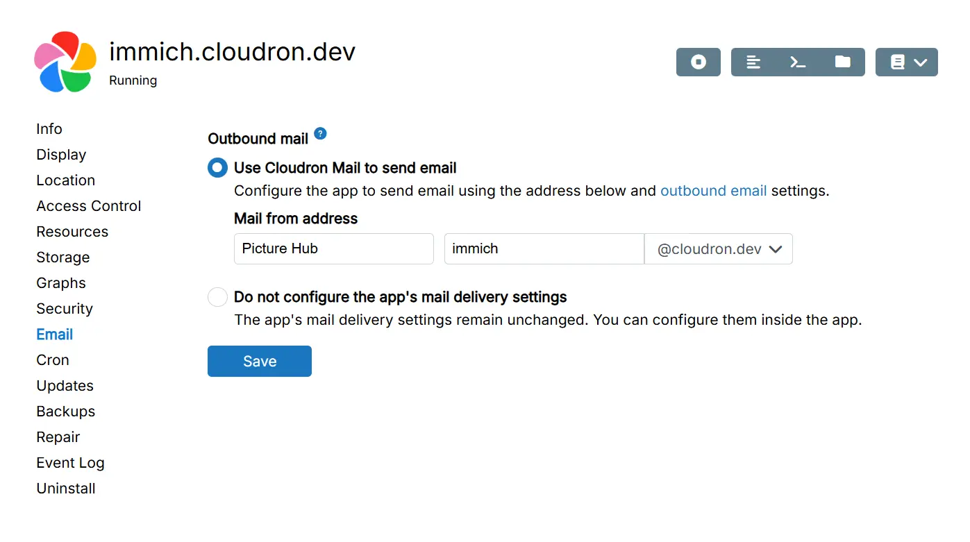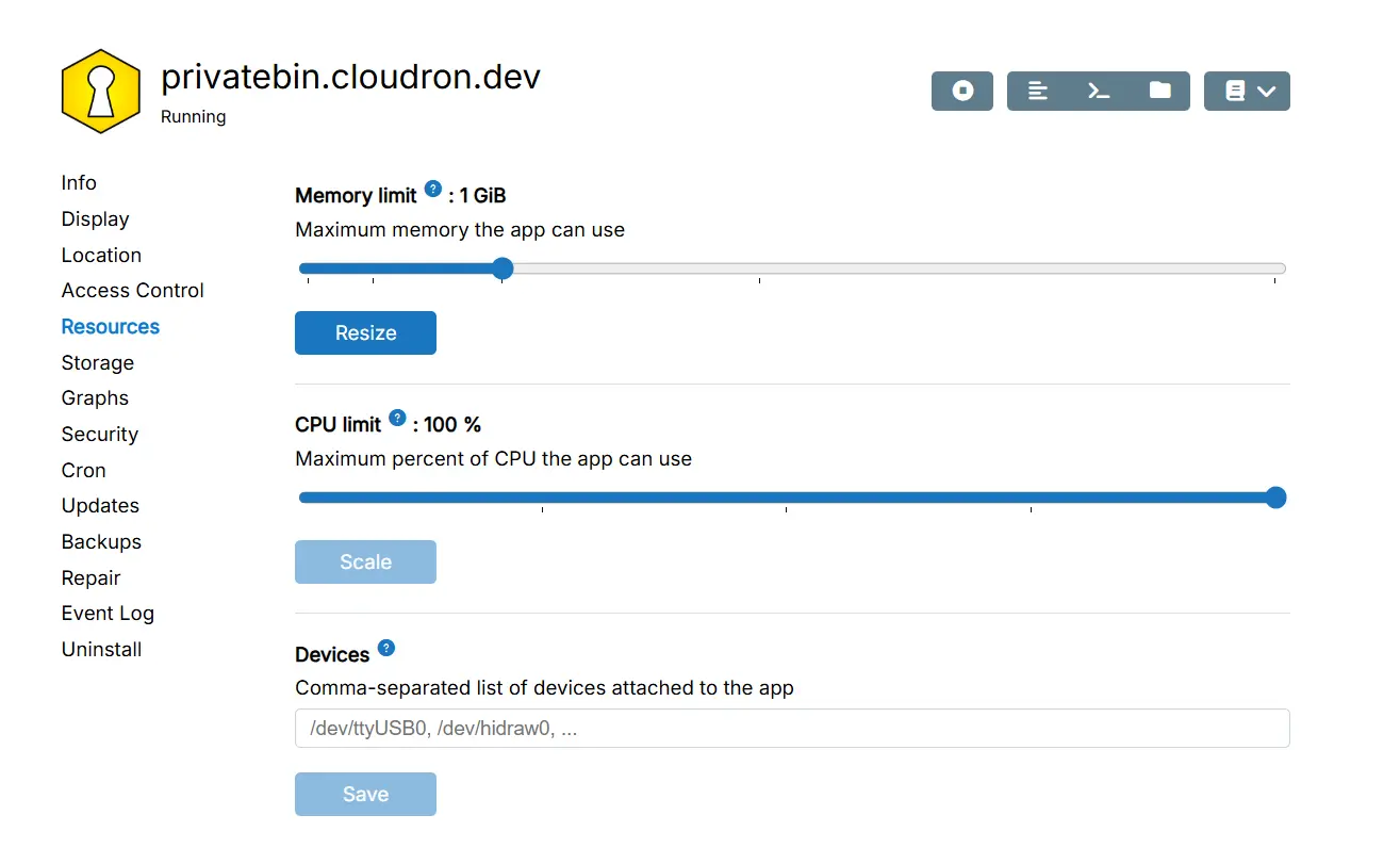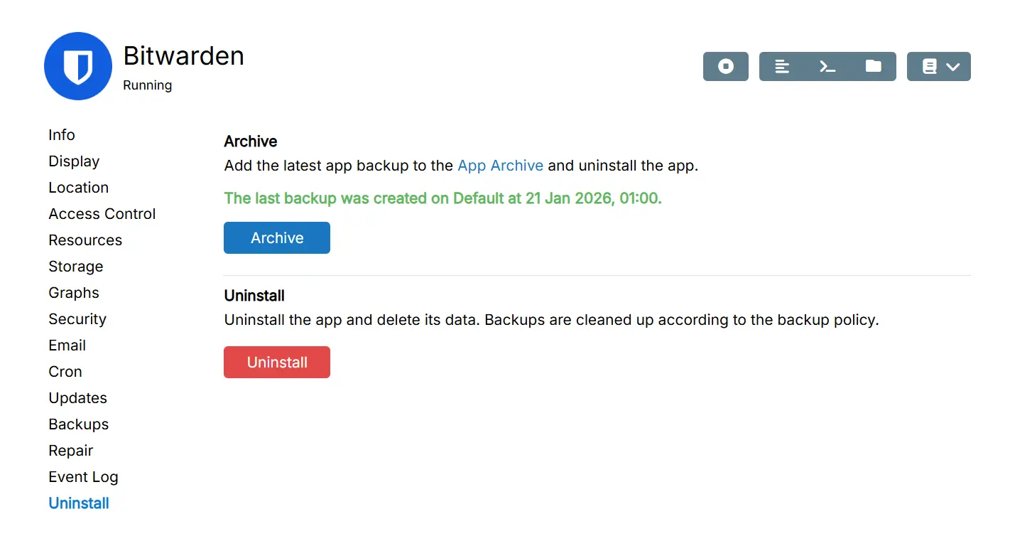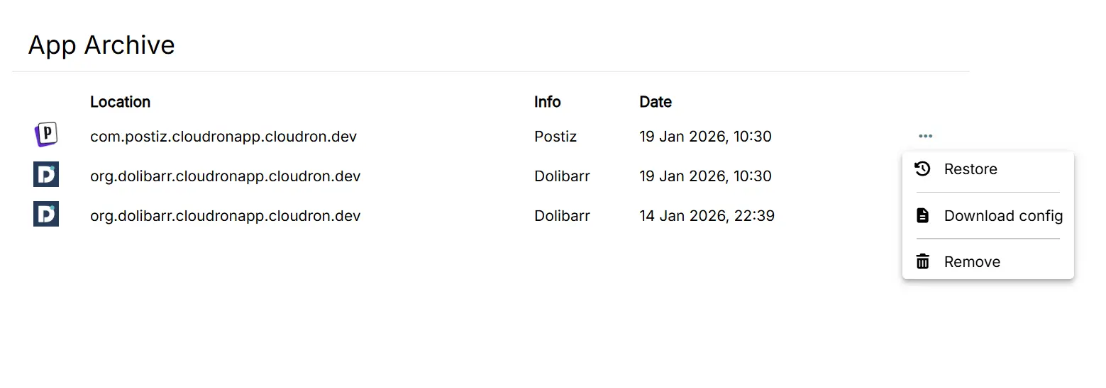 App Title and Version- This is the app's title and the upstream app versionApp ID- Unique ID of the app instancePackage Version- Version of the Cloudron package. This is distinct from the (upstream) App VersionInstalled At- When the app was installedLast Updated- When the app was last updated