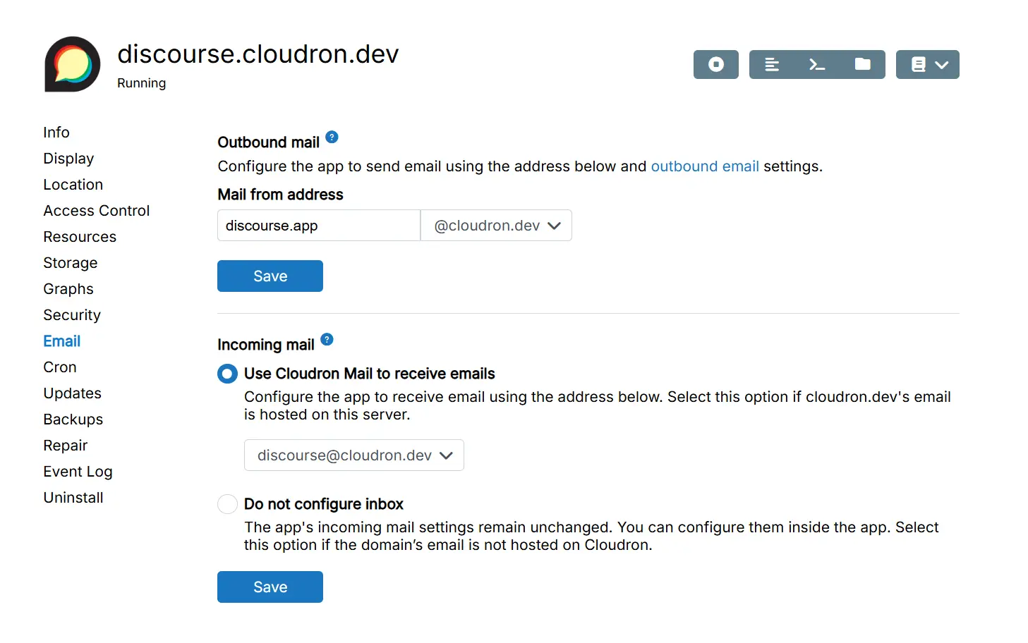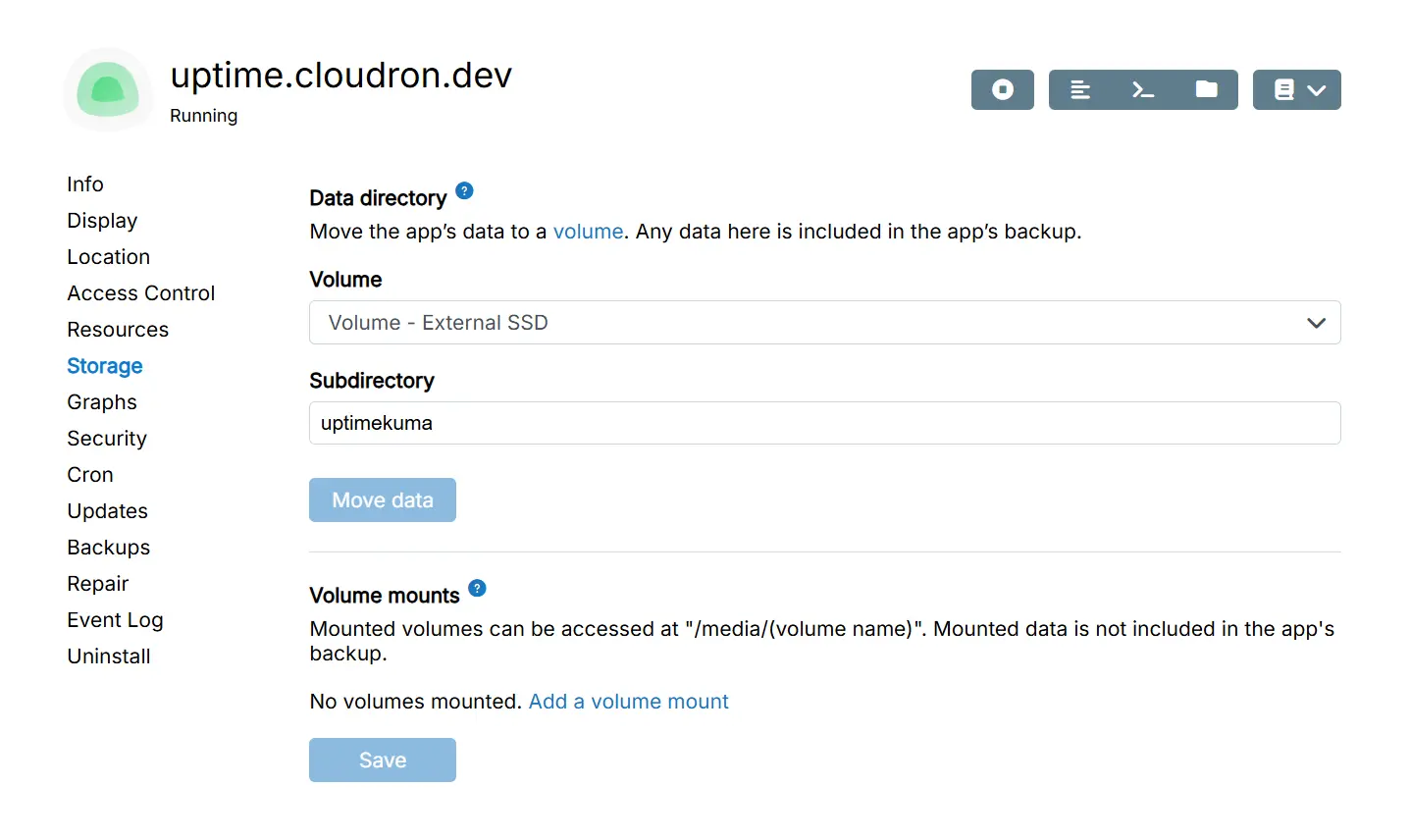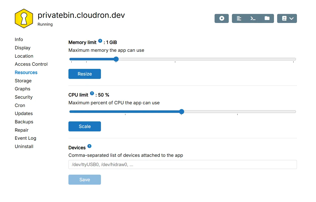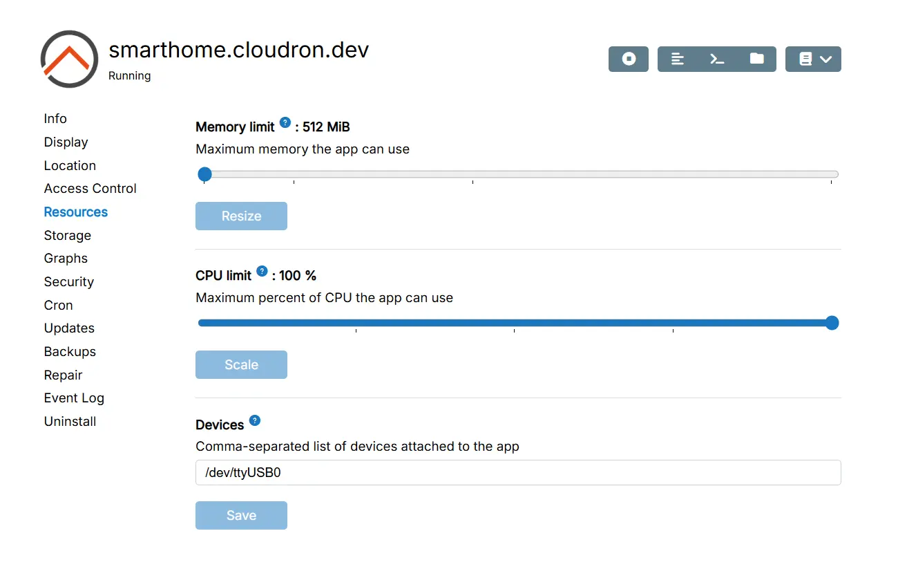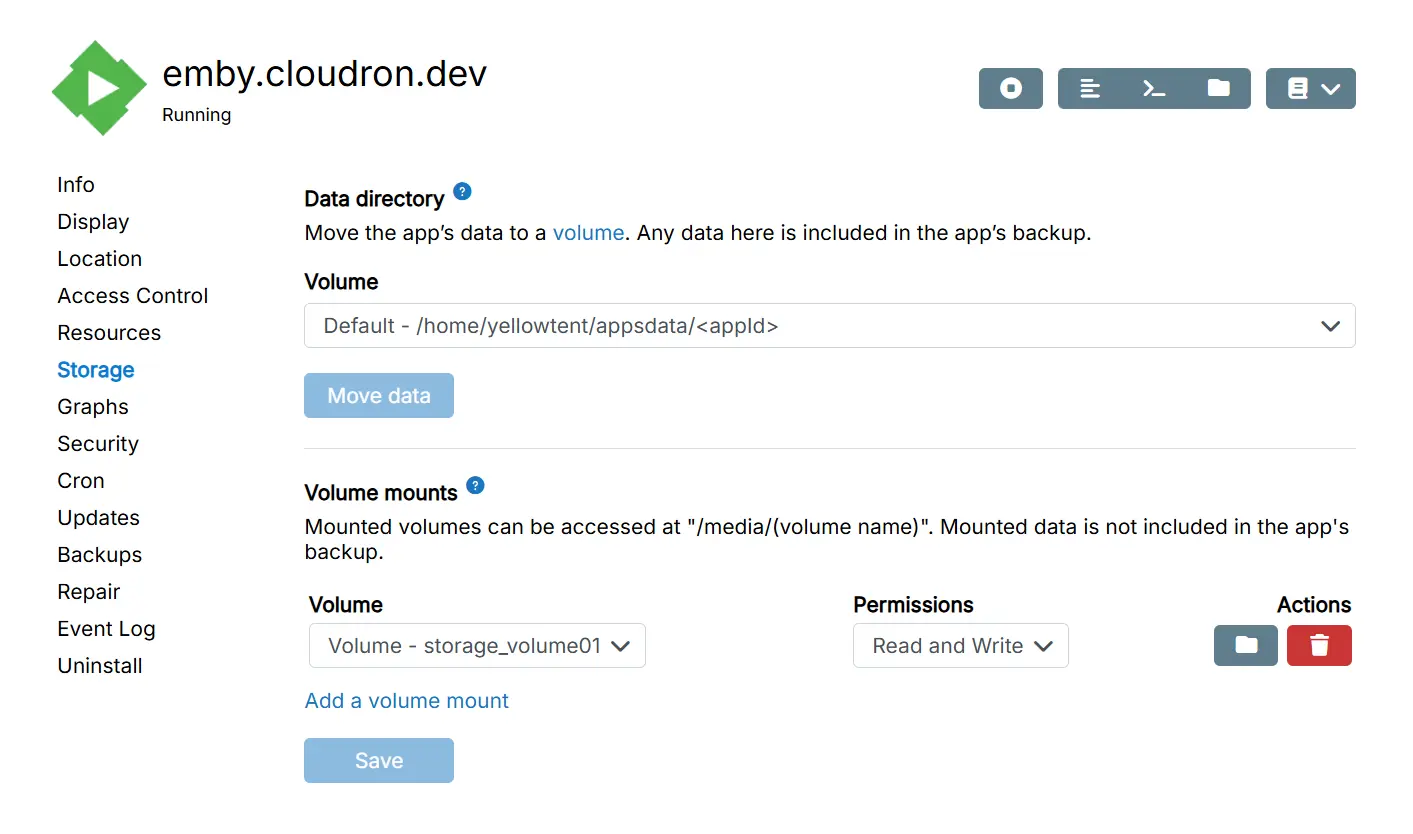 App Title and Version- This is the app's title and the upstream app versionApp ID- Unique ID of the app instancePackage Version- Version of the Cloudron package. This is distinct from the (upstream) App VersionInstalled At- When the app was installedLast Updated- When the app was last updated
