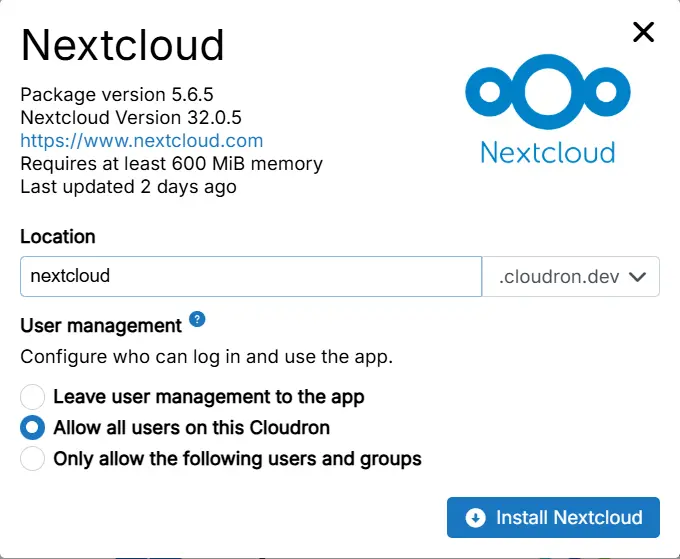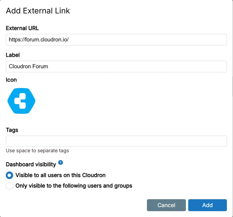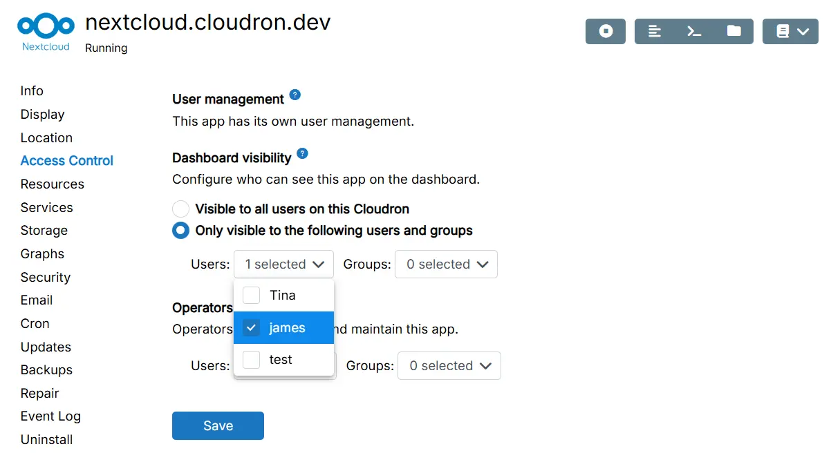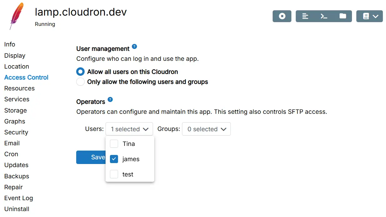 Allow all users from this Cloudron- Any user in the Cloudron can access the app.Only allow the following users and groups- Only the users and groups can access the app.