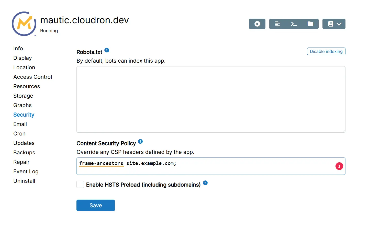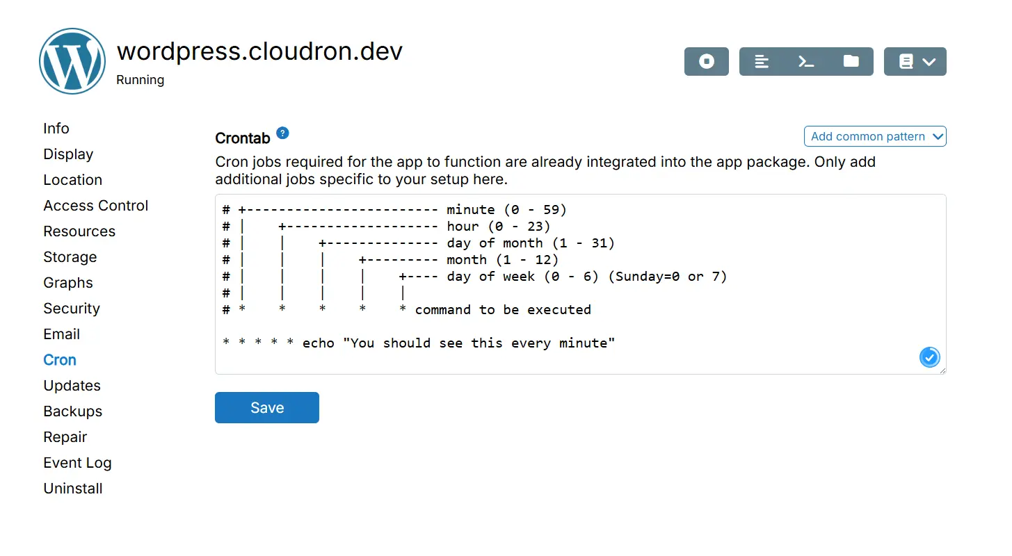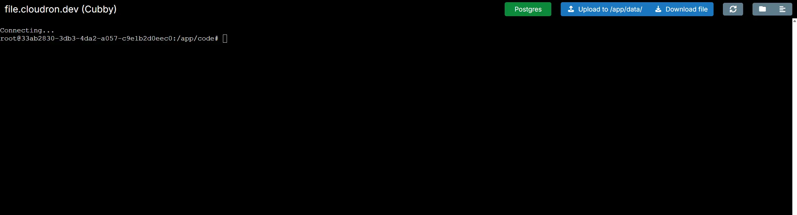 start.shscript using the Web Terminal. This script is usually located under/app/pkgor/app/code(this is a Cloudron packaging convention). -