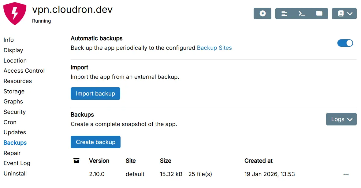 As the app is hosted externally, managing app updates and backups of proxied apps are outside the scope of Cloudron.