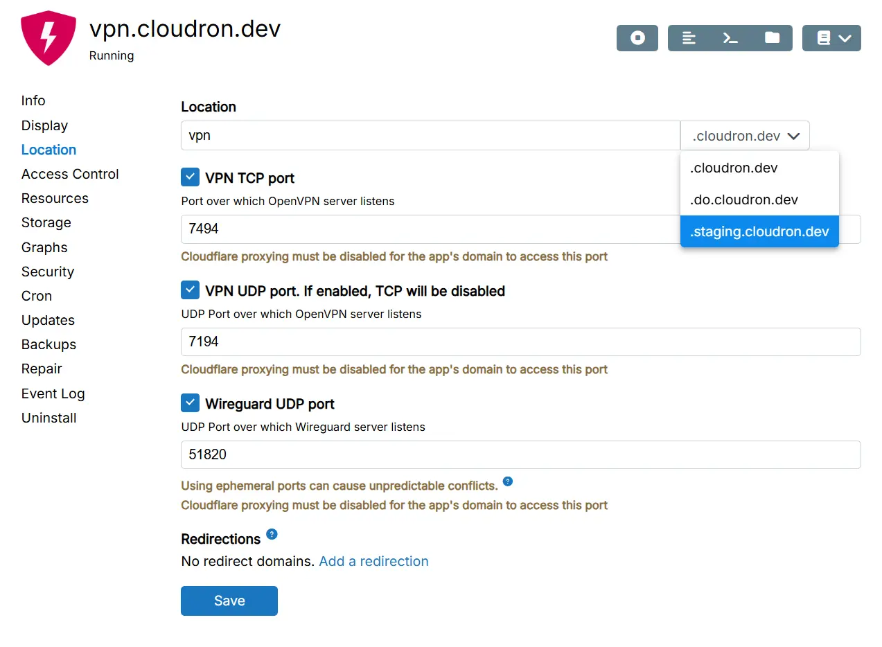 In the above example, the UDP Port of the VPN app is exposed at port 7194. The TCP Port is disabled.