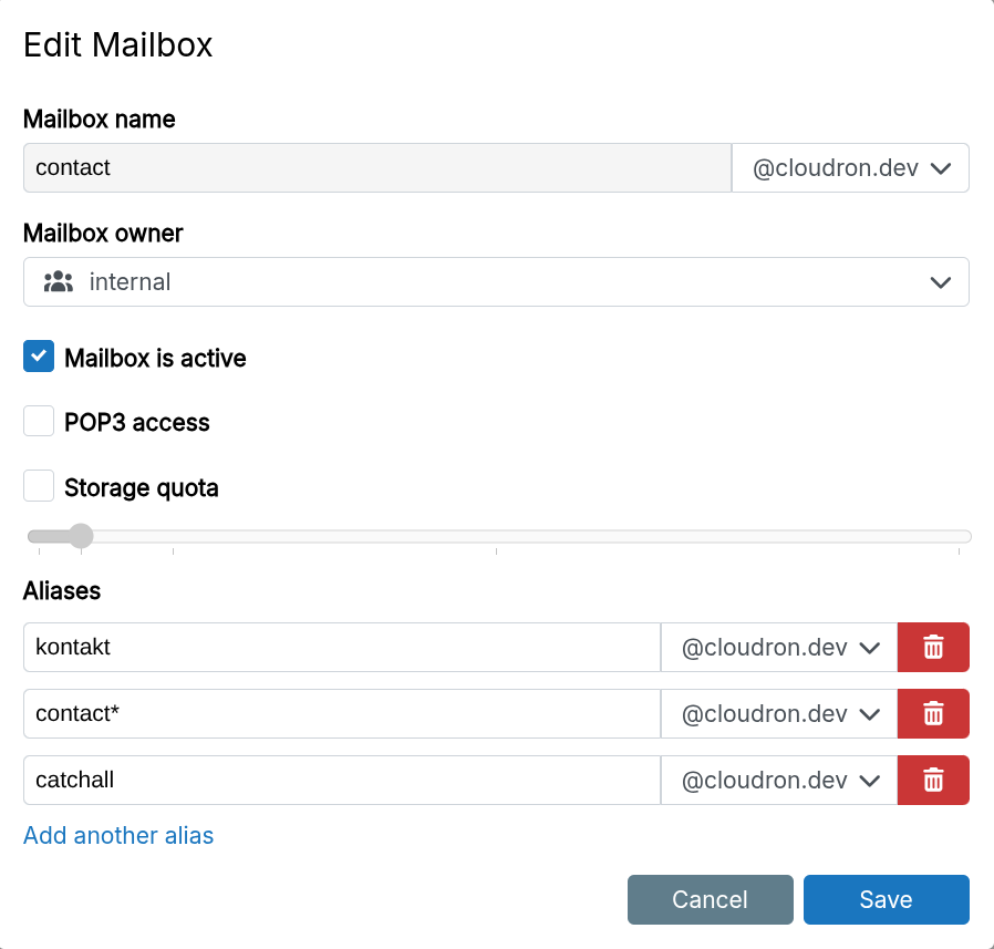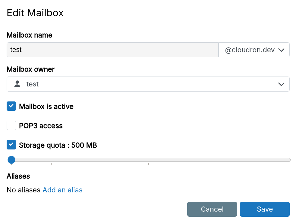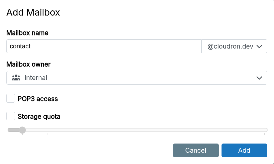 Select an existing user or group as the owner. Users access email with the new address and their platform password via SMTP and IMAP. Group mailboxes are accessible by any group member using their password.