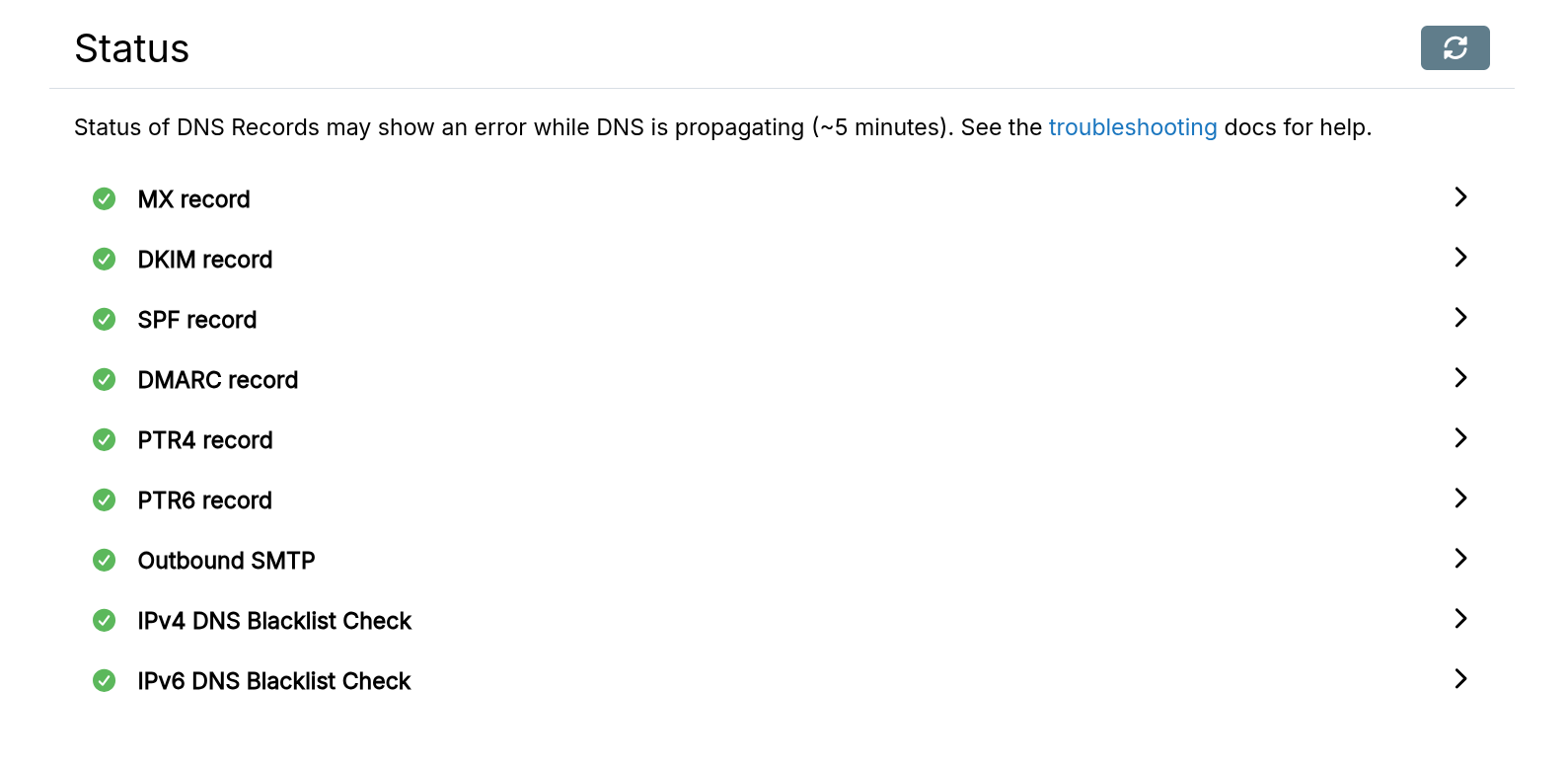 The status of the DNS and Email delivery is available in the Status tab of the mail domain (Email -> Select Domain -> Status).