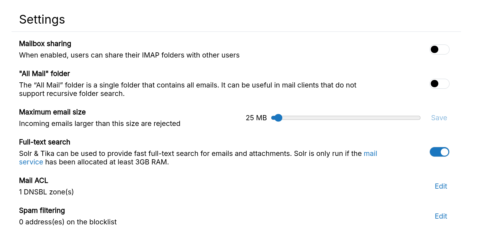 - Email can only be relayed (including same-domain emails) by authenticated users using SMTP/STARTTLS.