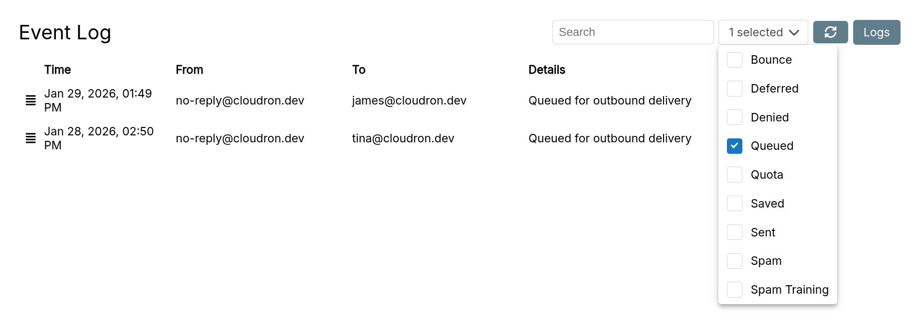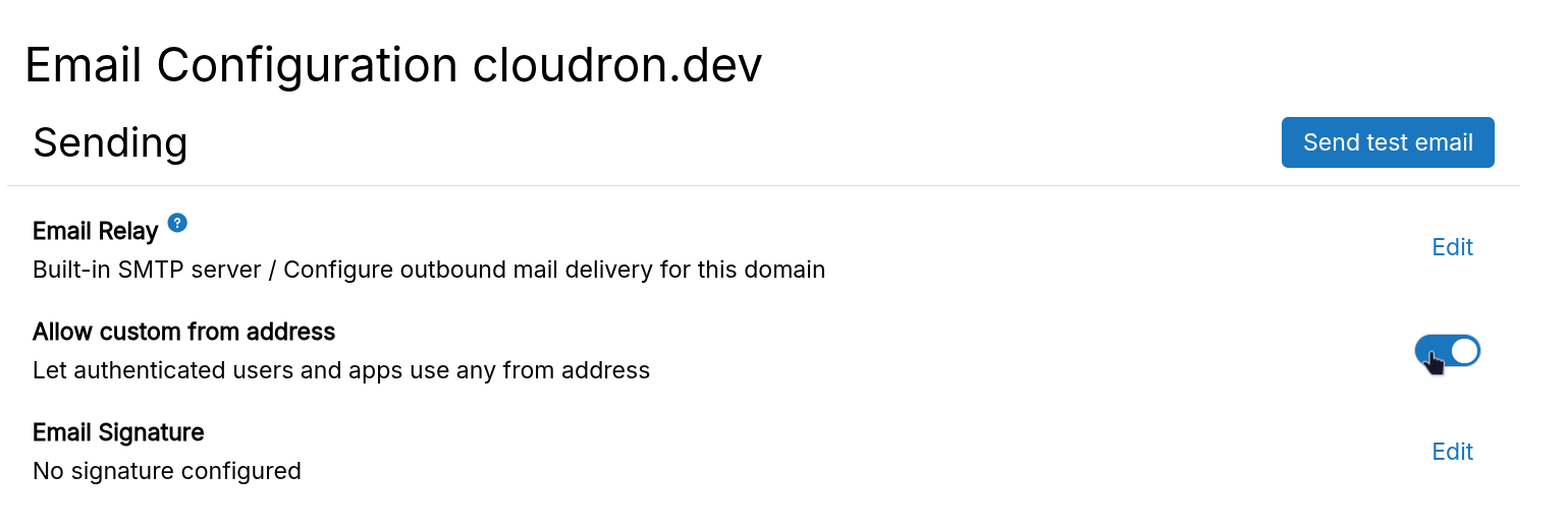 MAIL FROMis the same as the authenticated user. Users cannot spoof each other. - All outgoing mails from Cloudron are