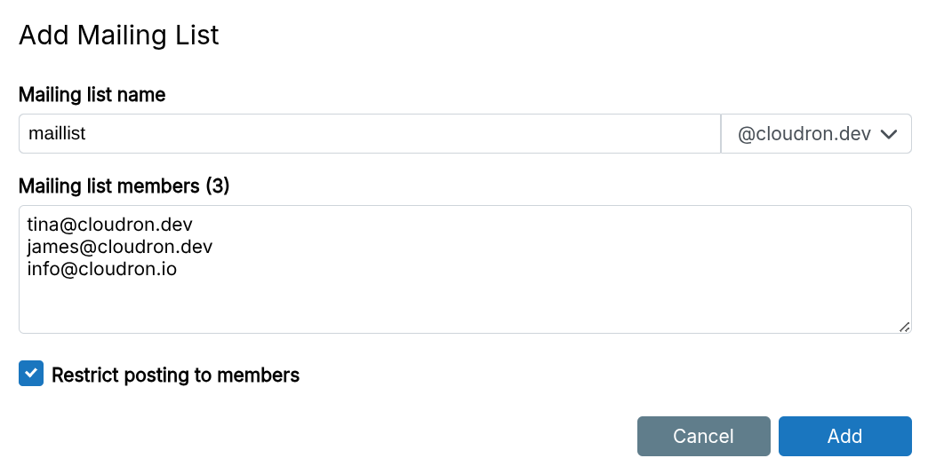 A Mailing list forwards emails to one or more email addresses. Create a list in the Mailing Lists view.